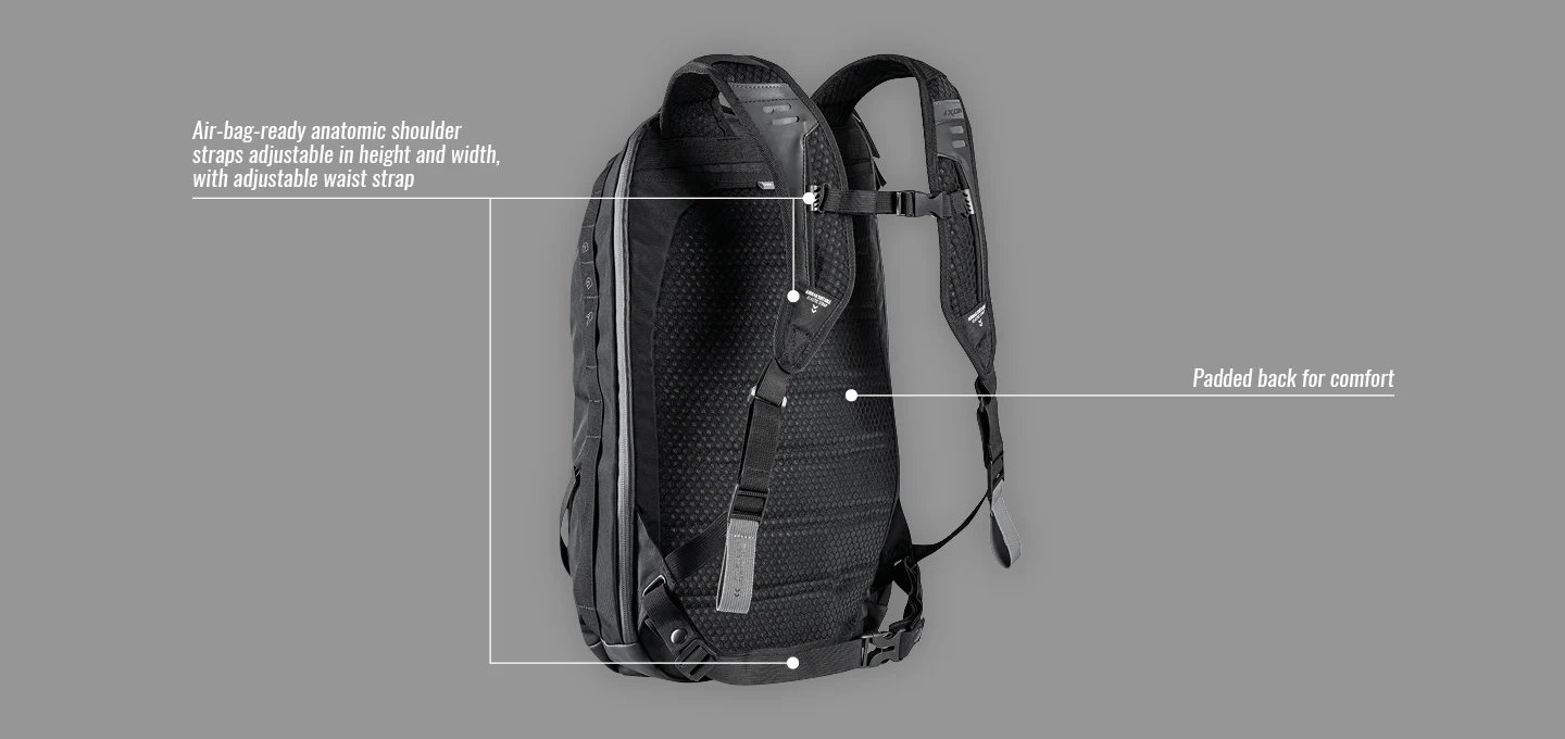 Pielāgojamas plecu siksnas un krūšu siksna, kas nodrošina stabilu fitu un palīdz saglabāt somu vietā, pat pārvietojoties lielos ātrumos vai veicot dažādas aktivitātes.